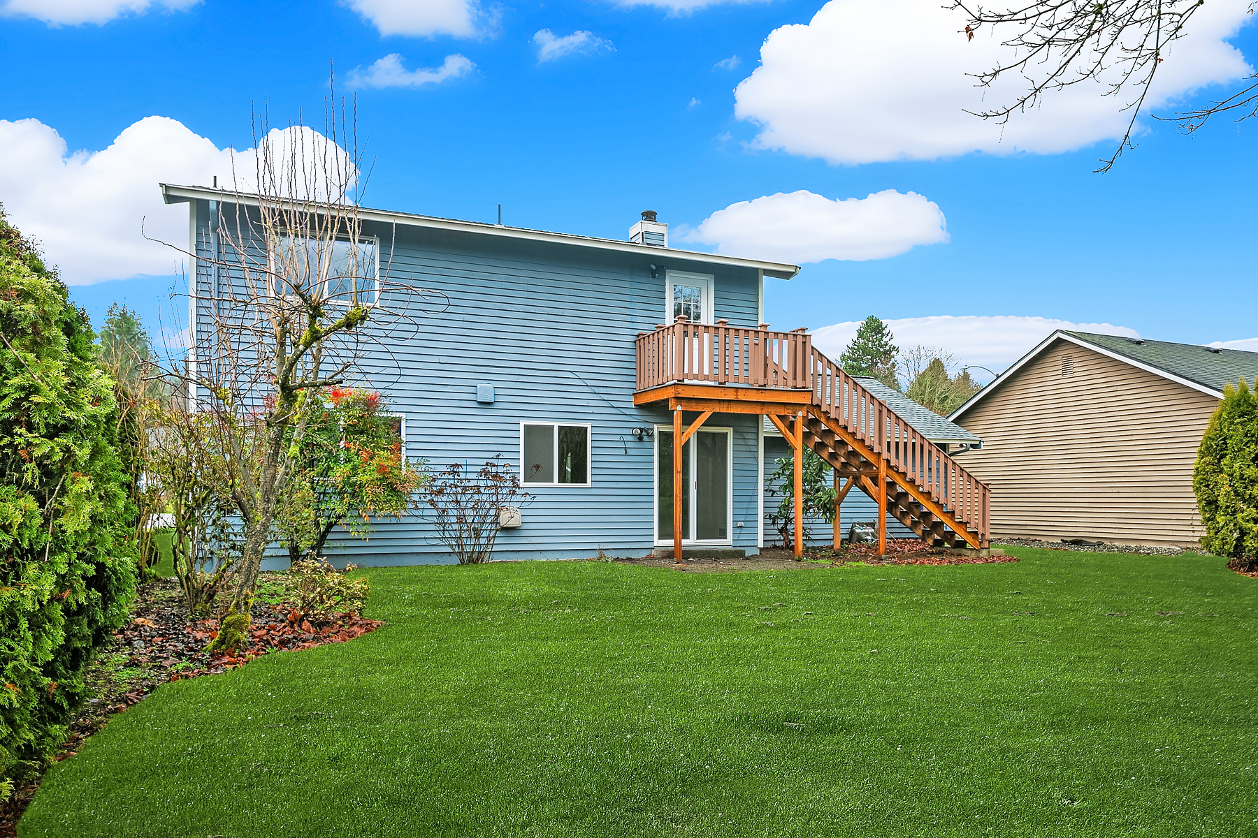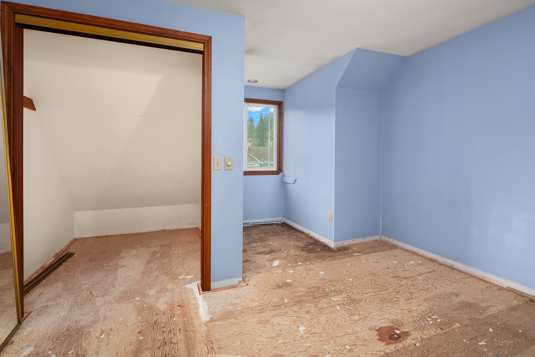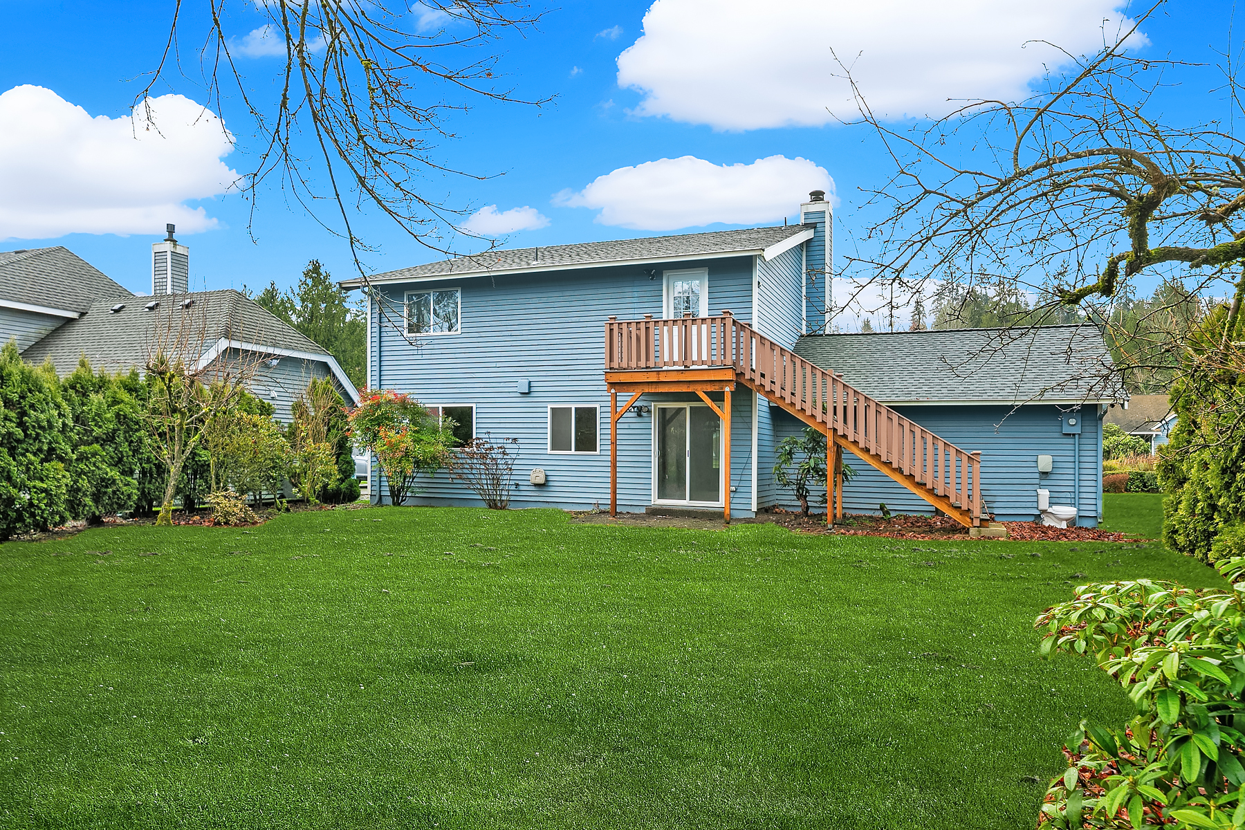 Investor opportunity in a prime Mill Creek location. This single-family home is ready for cosmetic updates and value-add potential. Solid bones include a newer roof, wood siding, and a flat 6,000+ sq ft lot backing to a desirable greenbelt. Two bedrooms and full bath on the main level, living room with wood-burning fireplace, and kitchen ready for renovation. Upper level offers a large primary suite with attached bath, additional bedroom, and rec room. Two-car attached garage. Quiet cul-de-sac just blocks to Mill Creek Town Center, shopping, and dining. Estate sale—sold AS-IS. Cash only.